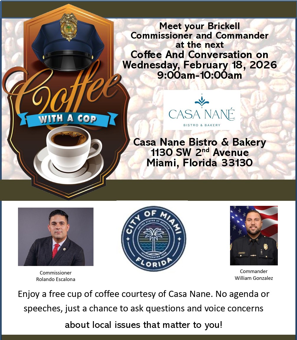 Meet your Brickell Commissioner and Commander at the next Coffee And Conversation on Wednesday, February 18, 2026 9:00am-10:00am . Click on the flyer for more info.