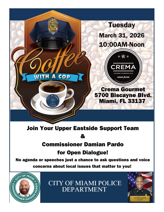 Meet your Brickell Commissioner and Commander at the next Coffee And Conversation on Tuesday, March 31st, 2026 10:00am-12:00pm. Click on the flyer for more info.